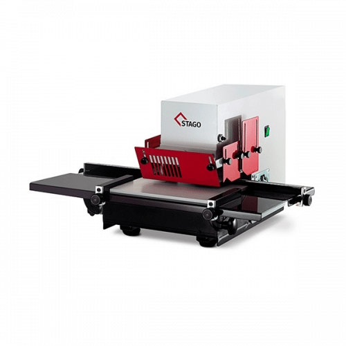 • Sólida construcción metálica con amplia bandeja de entrada, provista de guías laterales y de profundidad, así como mecanismo adaptable para grapado en plano o caballete.