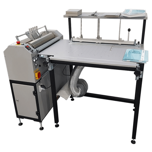 - Un equipo para recubrir una capa delgada de pegamento en superficies planas como papel, cuero, PVC y la producción de cubiertas para tapa dura, cabezales de calendario, etc. Consiste en: un laminado para aplicar pegamento caliente y una mesa de montaje.